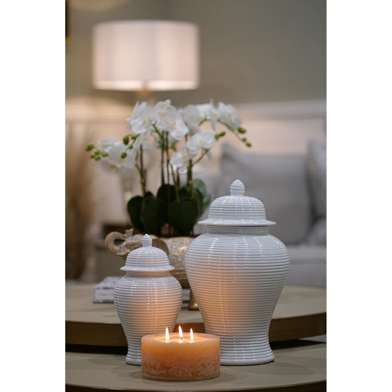 This white ridged porcelain ginger jar gives your interior that beach Hampton's vibe! Perfect for shelf styling, paired in two's or used as a solo feature piece.
