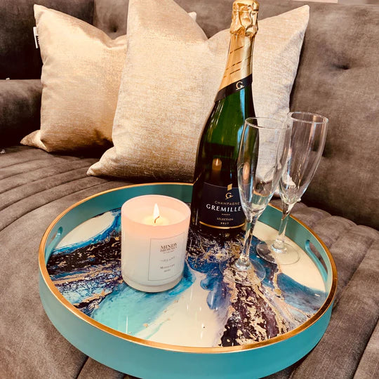 Introduce a splash of colour to your decor with the Marine Wonder vibrant glass coloured serving tray, emerald green tones, black and gold are featured in this beautiful tray.